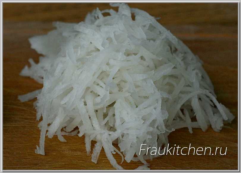 Перетрите редьку через терку или мелко нарежьте тонкой соломкой. Первый вариант окажется проще и быстрее, особенно если у вас на вооружении имеется специальная овощерезка.