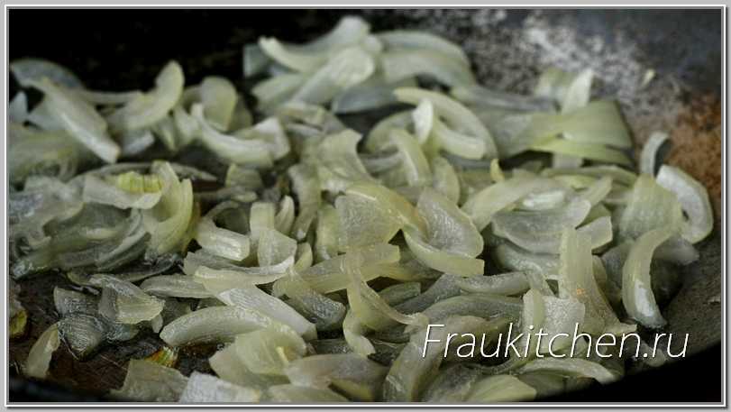 Очищаю лук и нарезаю его тонкими полукольцами вдоль луковицы. Обжариваю лук с небольшим количеством растительного масла на маленьком огне до абсолютной мягкости 15- 20 минут. Выключаю огонь и остужаю.