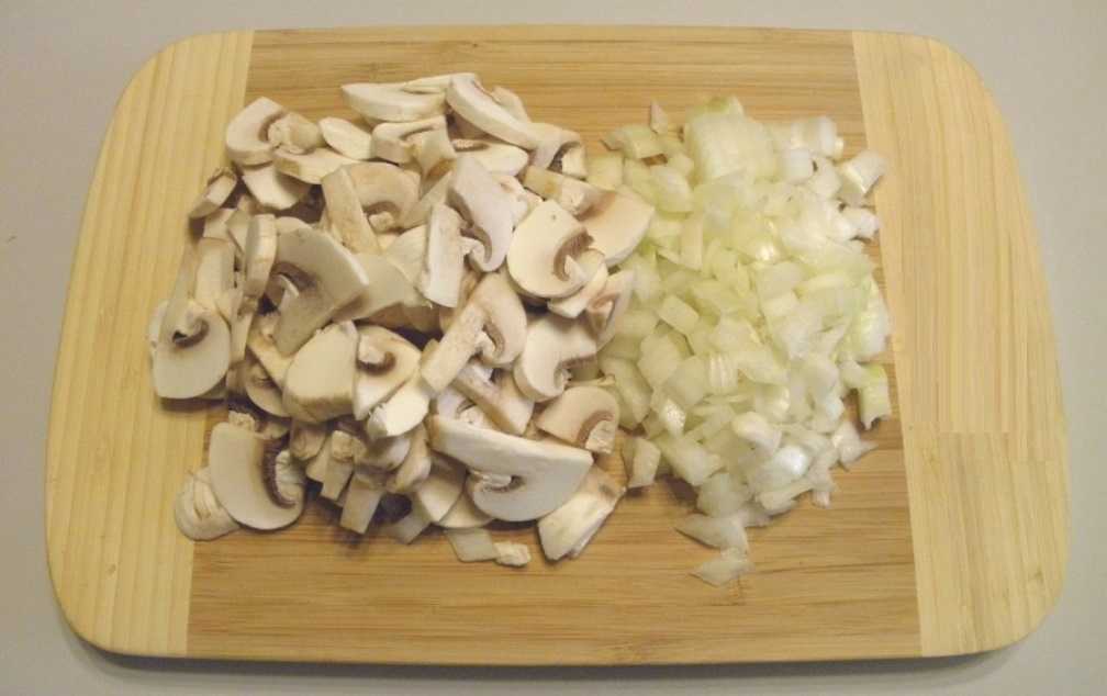 Грибы промываем, очищаем и нарезаем мелкими кубиками. Луковицу также мелко режем, соединяем с грибами и обжариваем массу до легкого золотистого цвета (не забудьте добавить немного масла, а также посолить продукты).