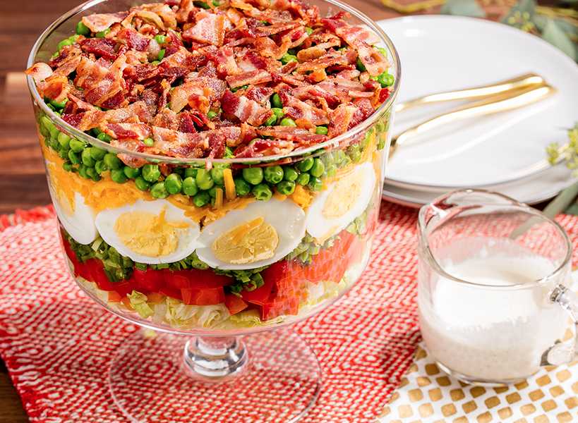 Этот слоеный салат украшен хрустящими грецкими орехами, что добавляет особый вкус блюду и делает его по-настоящему праздничным.