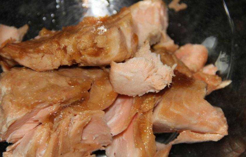 Вскрываем банки с горбушей, сцеживаем жидкость, перекладываем рыбу в тарелку.