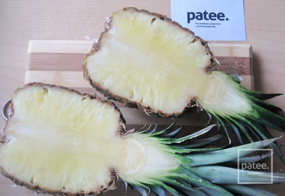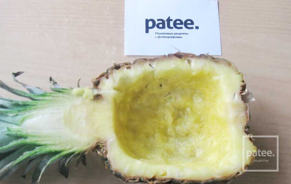 Из каждой половинки ананаса достаем ложкой или вырезаем ножом мякоть, оставляя стенки, как на фото.