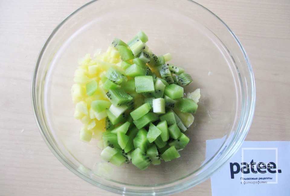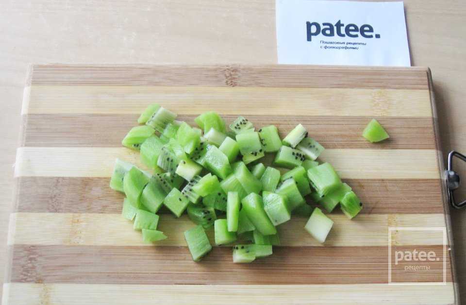 - Киви избавить от волосатой кожуры, нарезать мягкую часть кубиками.