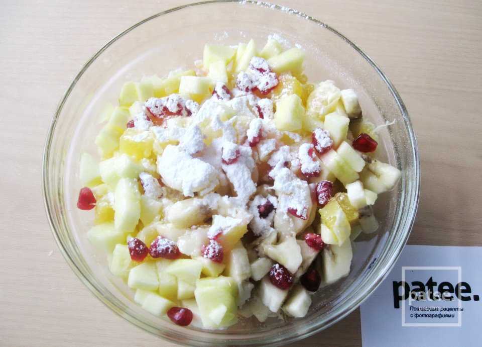 Добавляем к фруктам сахарную пудру по вкусу. Мне достаточно двух столовых ложек с горкой. Перемешиваем нарезанные фрукты с сахарной пудрой. Фрукты пустят сок, который и станет заправкой этого салата.