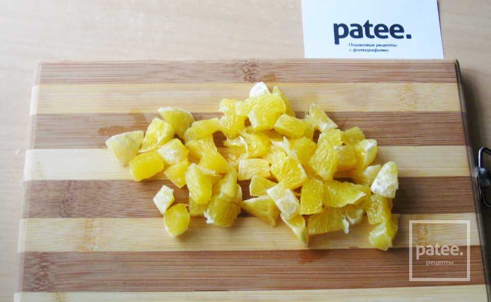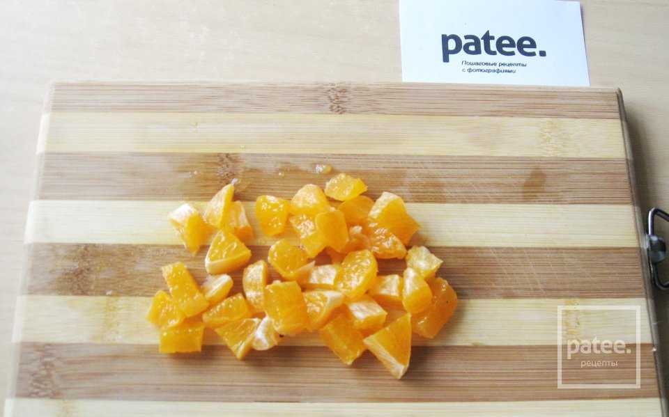 Мандарин моем, очищаем от кожуры и белых прожилок(по-возможности). Режем мелко.