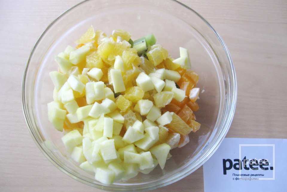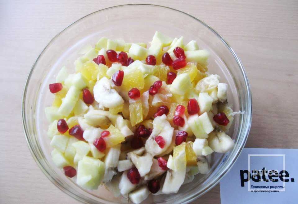 Теперь все измельченные фрукты смешайте в одной глубокой миске, добавьте к ним орешки и тщательно перемешайте. При этом не забудьте, предварительно измельчить крупные орехи, такие как грецкие или арахис. После этого заправьте салатик йогуртом или сахарной пудрой.