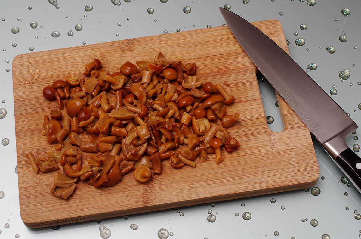 - Ополосните маринованные грибы, откиньте, чтобы стекла жидкость, крупные опята нарежьте.