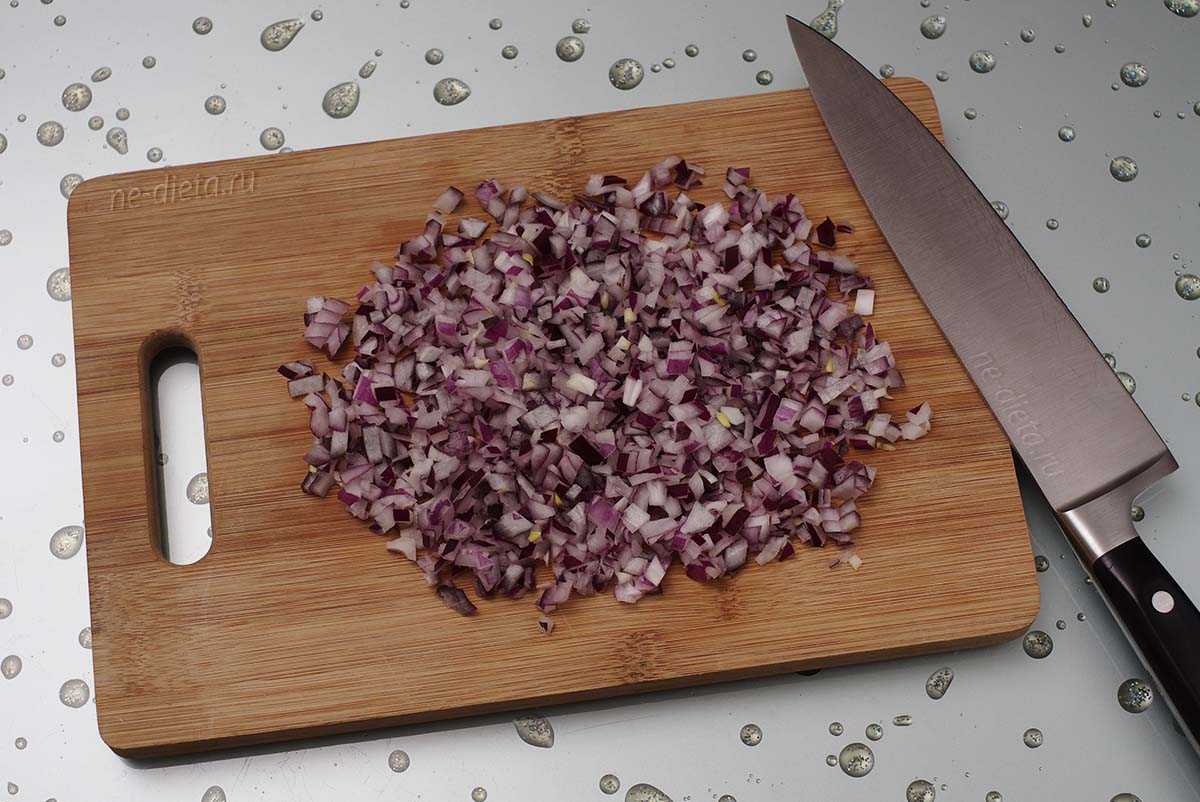 6. Репчатый лук очистить и очень мелко нашинковать. Советую использовать для приготовления деревенского салата сладкий красный или белый лук, но и обычный репчатый тоже вполне подойдет.