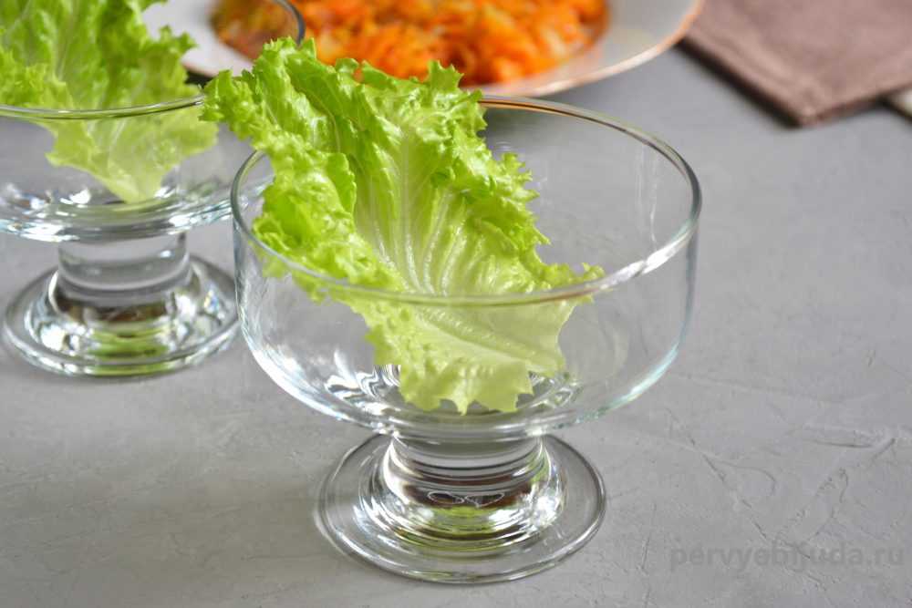 - Далее потребуется взять салатницу, застелить её салатными листьями.
