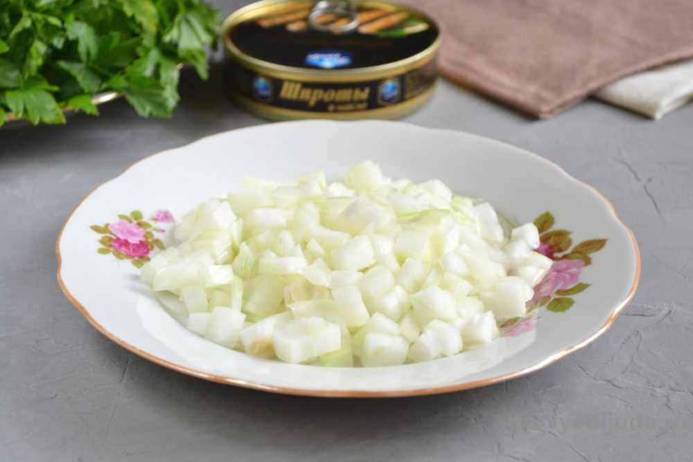 Почистить и порезать на мелкие кубики лук. Соединить его со шпротами и размять с помощью вилки.