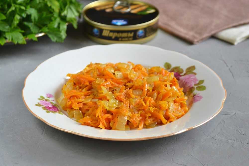 4. Пока жарится лук, морковку очищаем и крупно натираем. Отправляем измельченный овощ в сковороду с готовым луком и жарим, помешивая, пока не станет мягким. Перчим и солим.