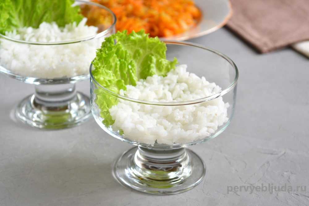 - 3-й слой — рассыпчатый отварной рис, промытый в нескольких водах;