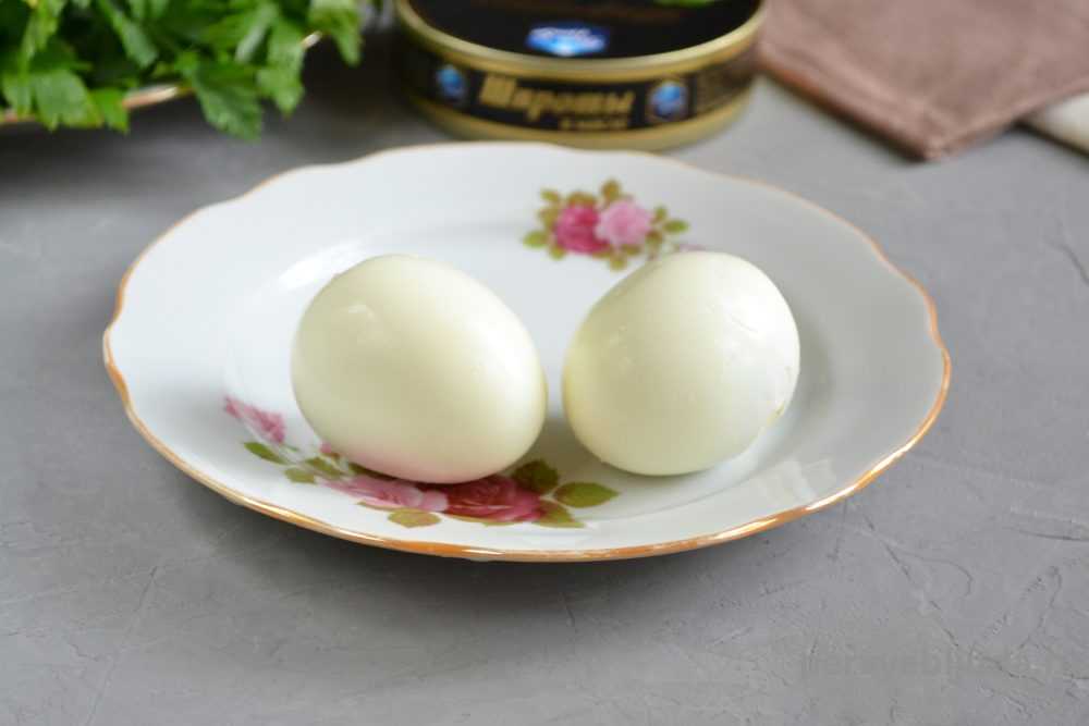 1. Куриные яйца отвариваем в воде до готовности около 9 минут. Заливаем ледяной водой, выдерживаем около 10 минут и очищаем от скорлупы.