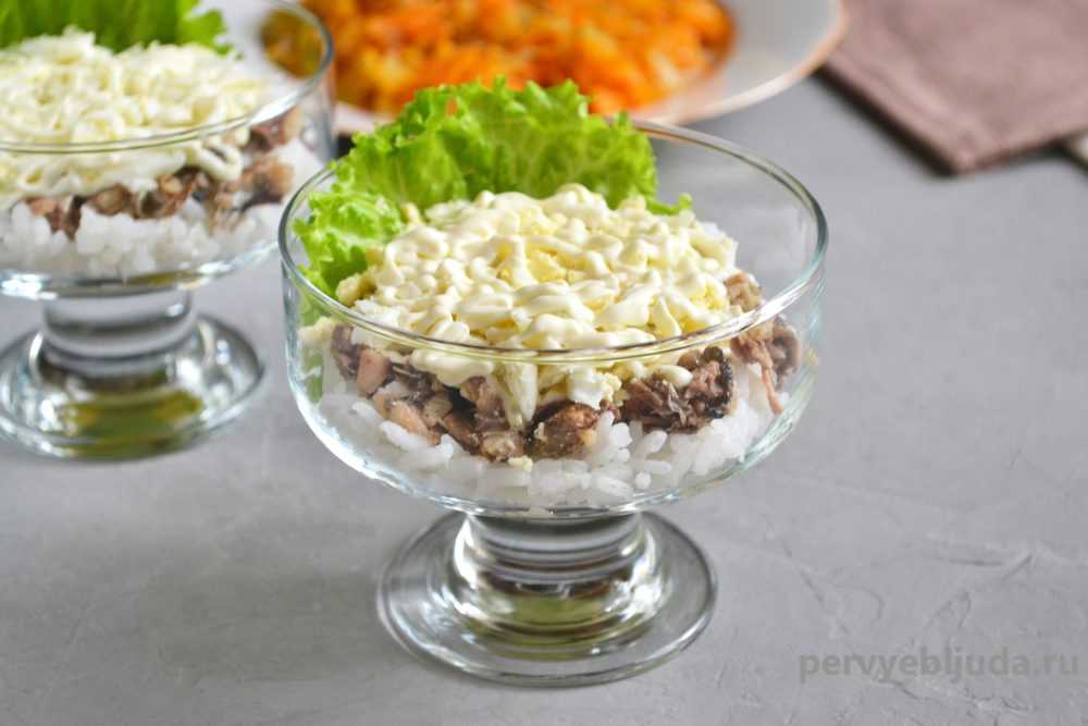 В первом варианте все ингредиенты, входящие в салат: рис, яйца, рыбные консервы и остальные продукты, укладываются аккуратно слоями в следующей последовательности: