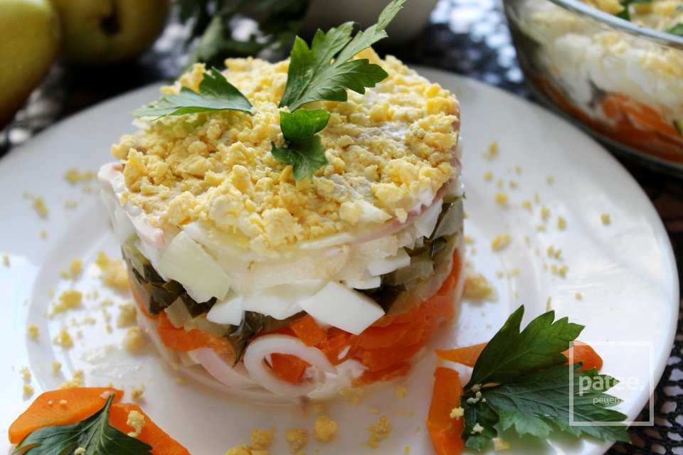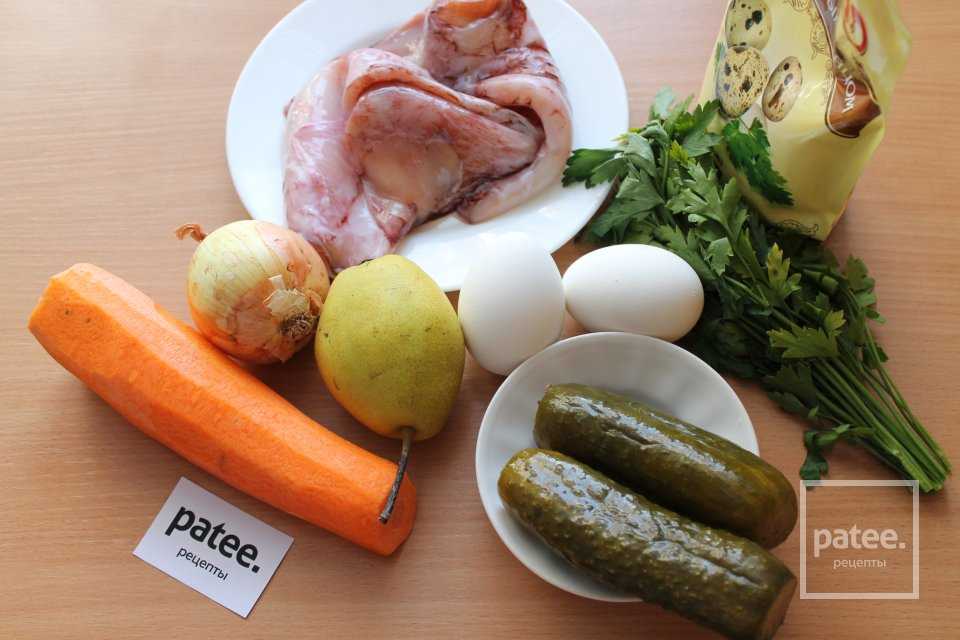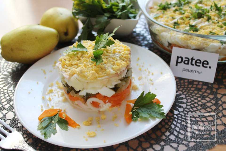 Описание рецепта — Салат «Адмирал» с кальмарами и грушей: