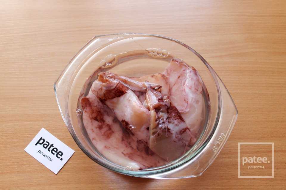 Кальмары разморозьте, залейте горячей водой, чтобы очистить верхнюю пленку.