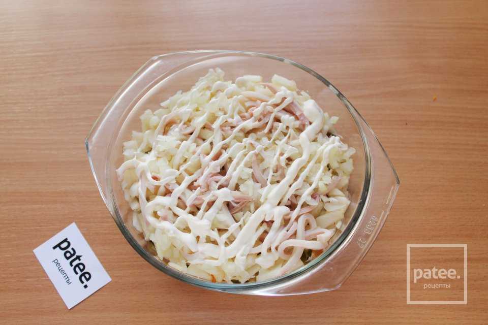 Начинаем “сборку” салата. Первым слоем уложите кальмары.