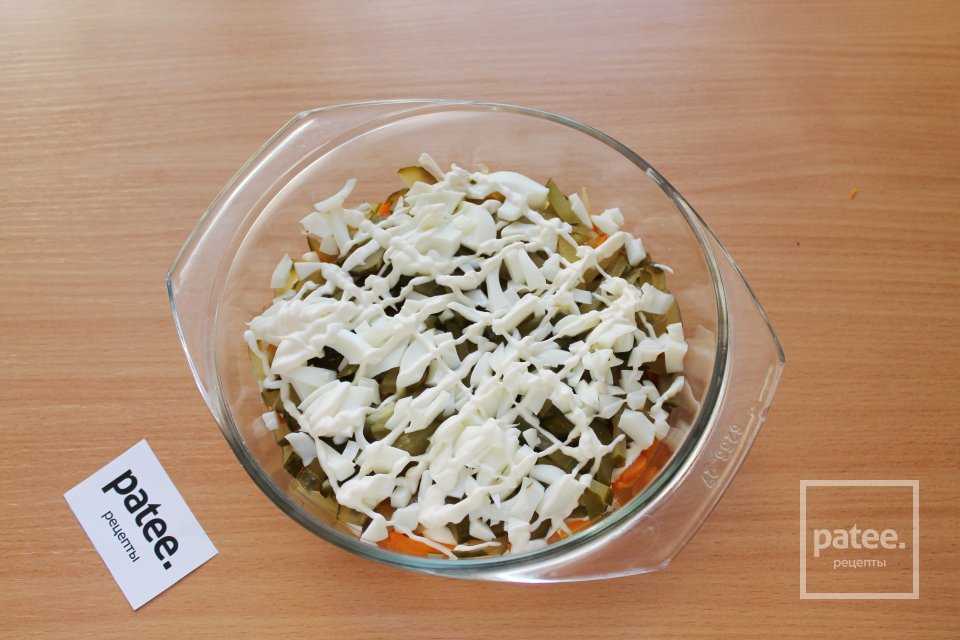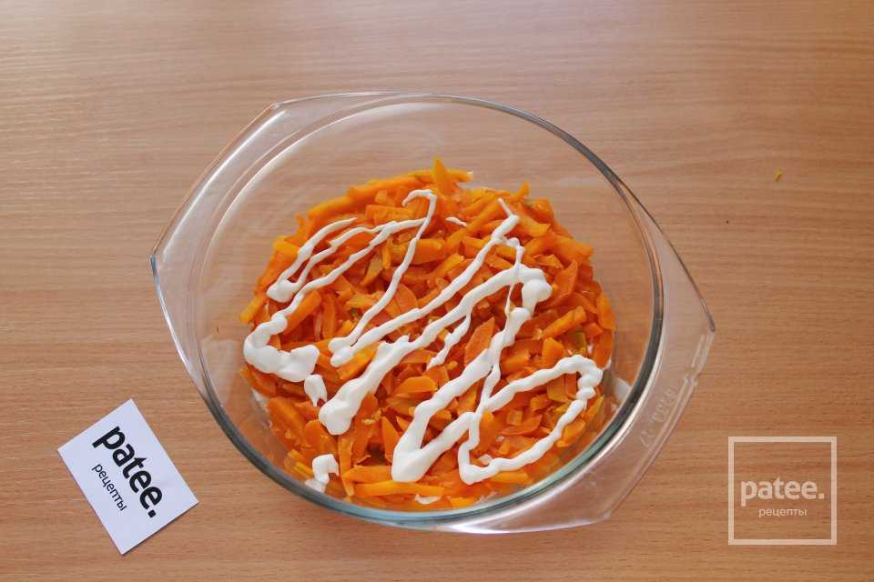 Следующим слоем выкладывайте морковь и снова майонез.
