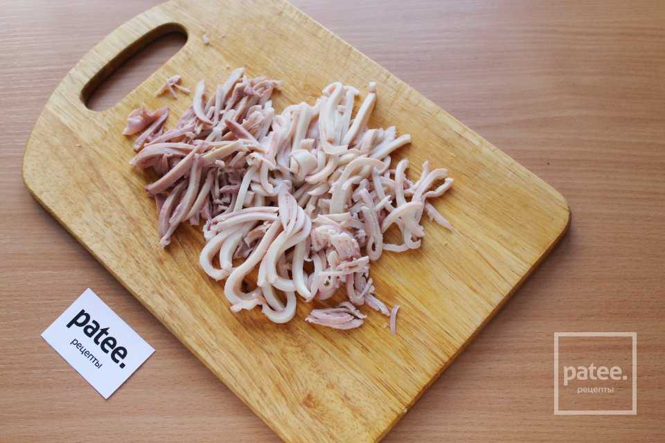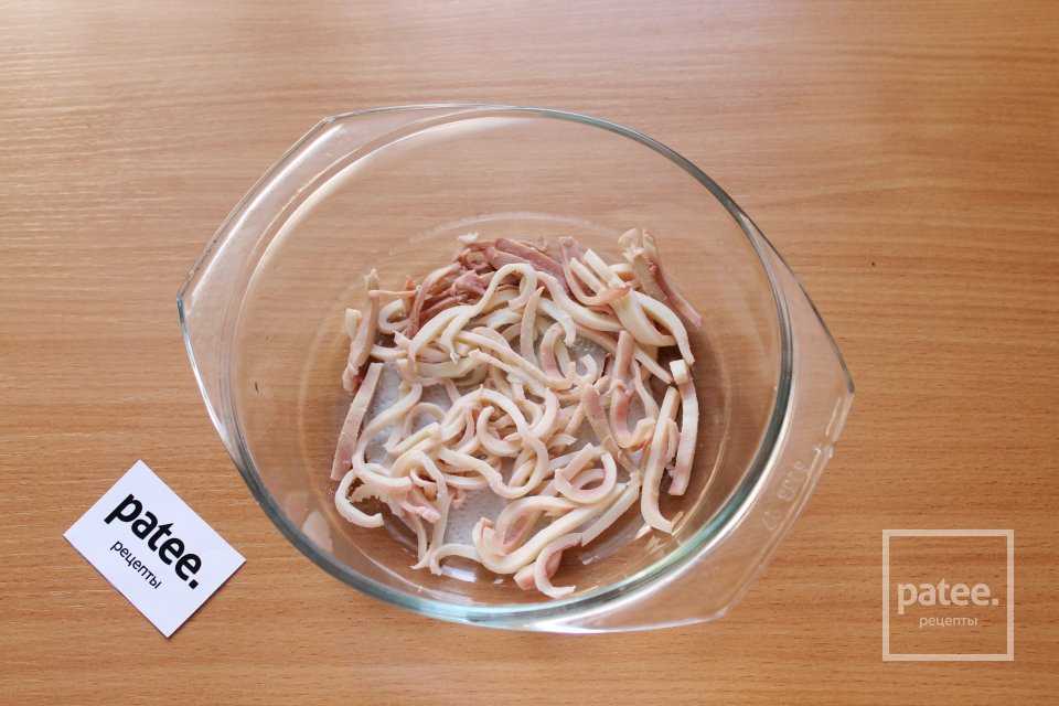 Нарежьте кальмары тонкой соломкой.
