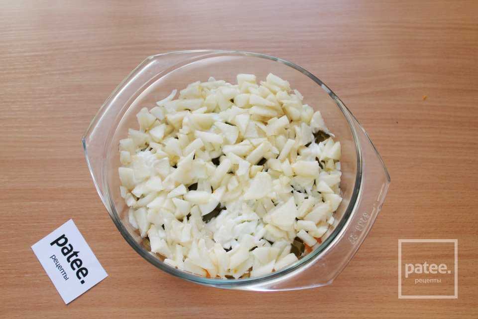 Следующий слой — груша. Снова покройте майонезной сеткой.