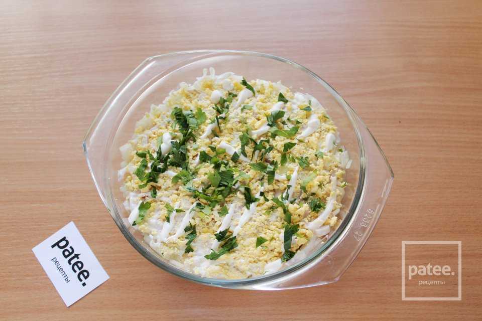 Завершите слои оставшимся луком и кальмарами, снова покройте майонезной сеткой, придавите все слои вилкой, утрамбовывая. Добавьте черного молотого перца.