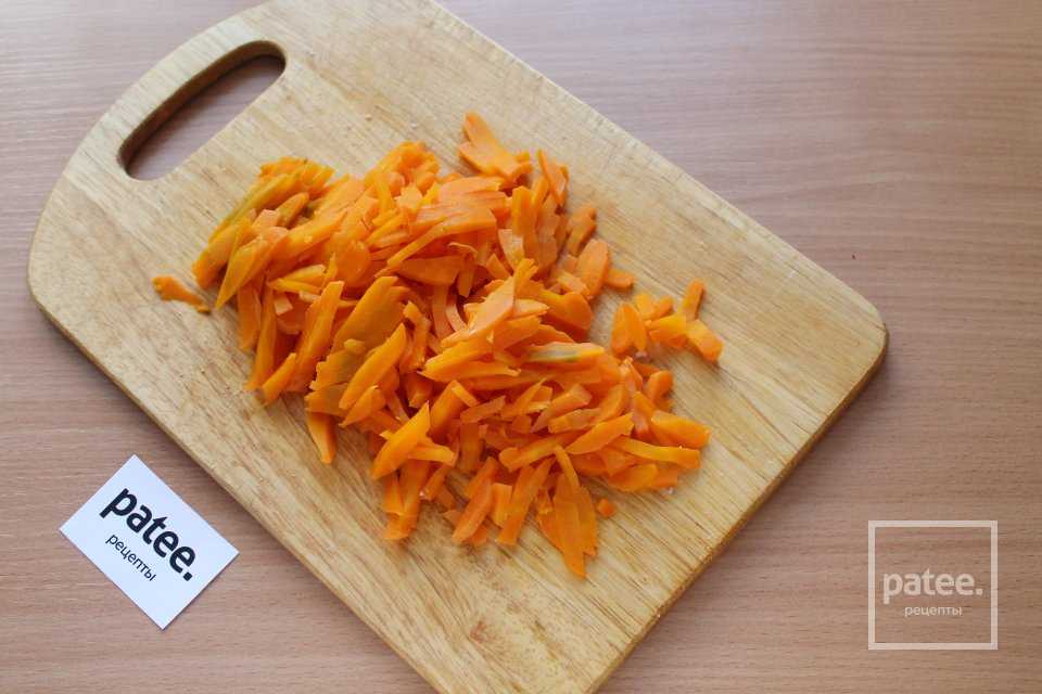 Нарежьте вареную морковь тонкой соломкой.