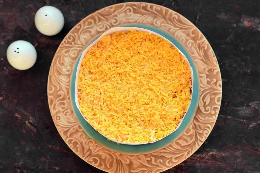 Далее идет консервированная кукуруза. Также смажем майонезом. Желтки, отложенные в сторону, натираем на терке мелко. Это будет украшением и верхним слоем салата.