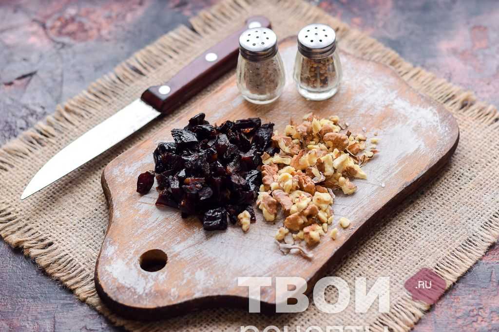 Чернослив вымыть и просушить бумажными салфетками, после нарезать чернослив кубиками небольшого размера. Если чернослив сухой, его необходимо распарить в кипятке 10 минут. Грецкие орехи нарубить ножом, или измельчить в чаше блендера.