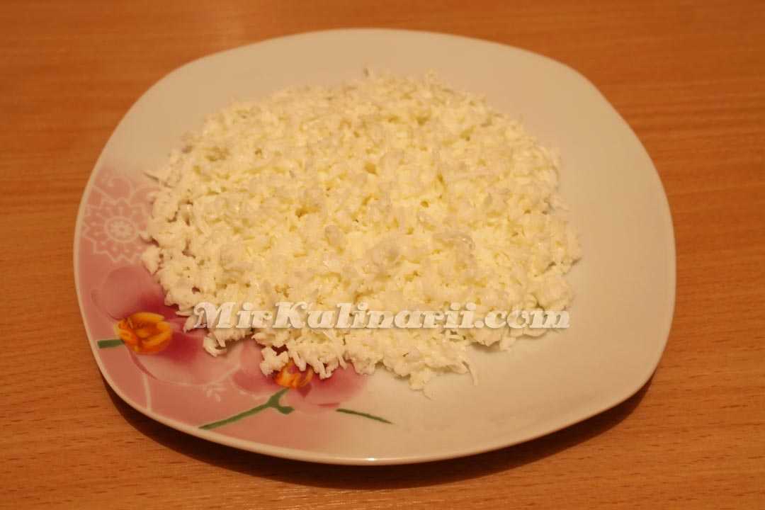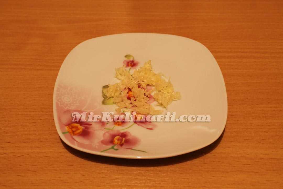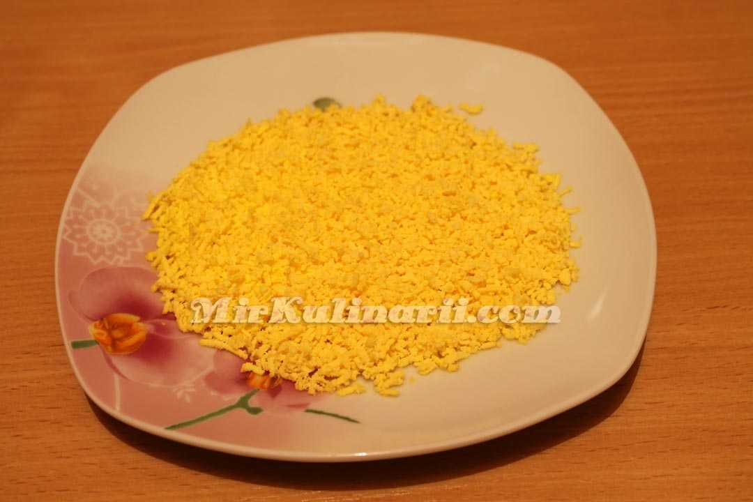 Куриные яйца отварить накануне в соленой воде – 8-10 минут, остудить и почистить, сразу разделить белки и желтки. Белок натереть средней стружкой, желток натереть на самой мелкой терке.