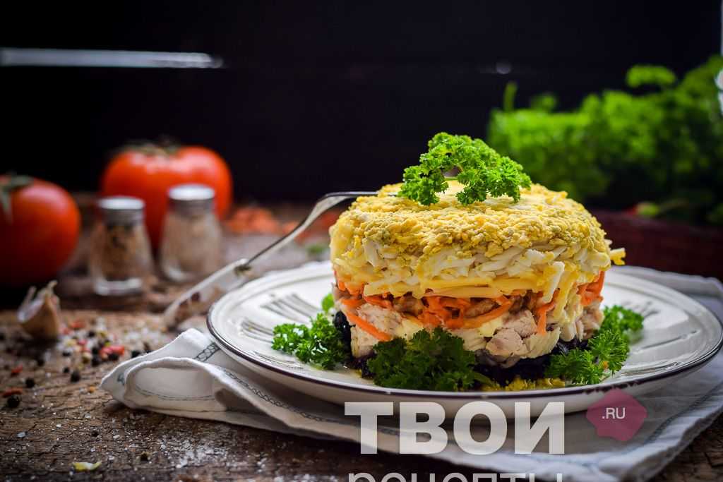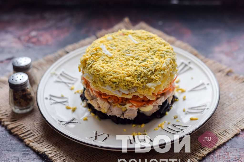 Готовое блюдо аппетитно смотрится на столе, салат не стыдно подать на праздничный стол. У блюда мясной вкус с интересными пикантными нотками корейской моркови и чернослива. Разнообразить блюдо можно, добавив слой измельченных грецких орехов или немного чеснока.