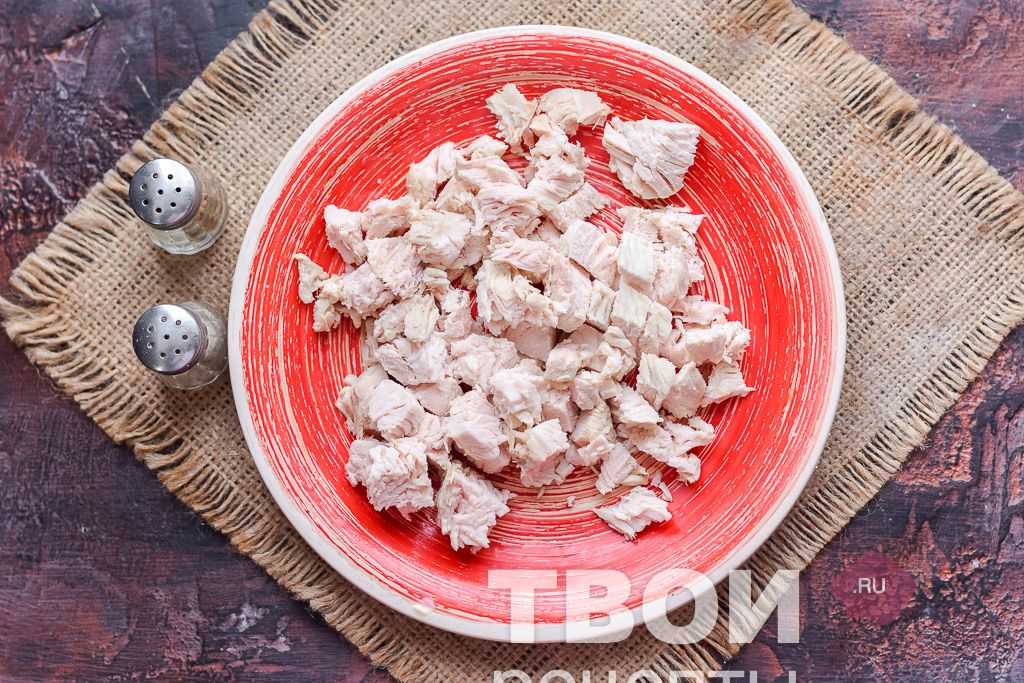 Индюшиное филе накануне отварить в подсоленной воде, после оставить индейку остывать в бульоне, до полного охлаждения, так мясо получится более нежным и сочным. Нарезать индейку небольшими кубиками.