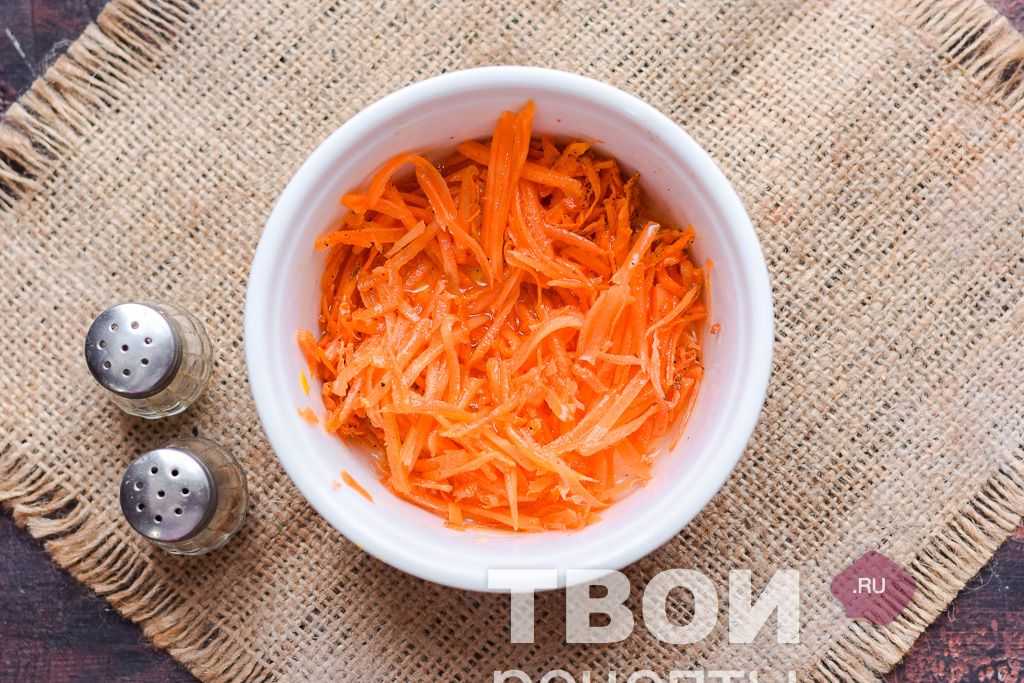 Морковь приготовить заранее, или же купить в проверенном месте готовый вариант. Слить из моркови лишнее масло с соком.