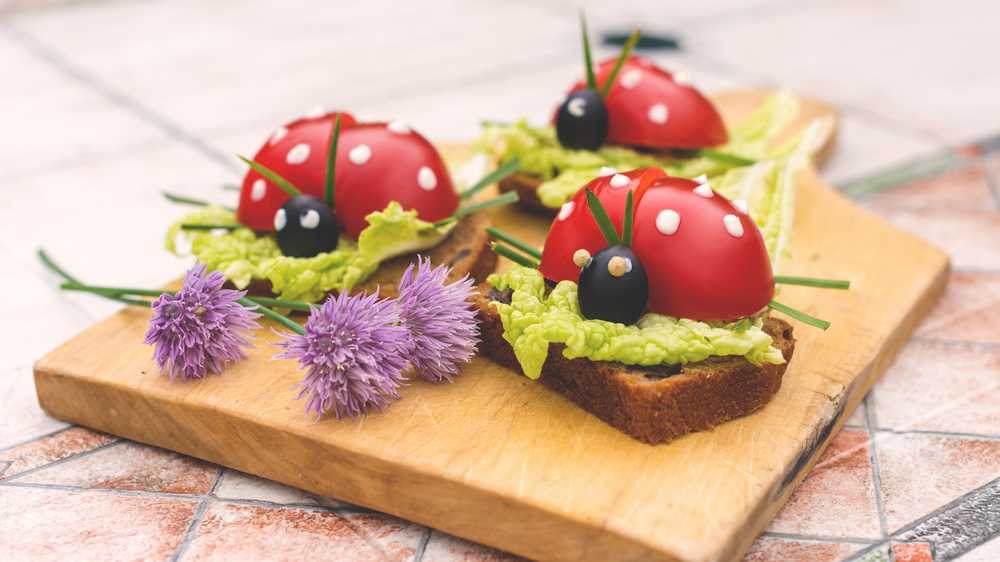 Разрежьте оливки на половинки и поместите их возле помидоров. Из зеленого лука сделайте лапки и усики «божьих коровок», а из майонеза и небольших кусочков оливок — глазки.