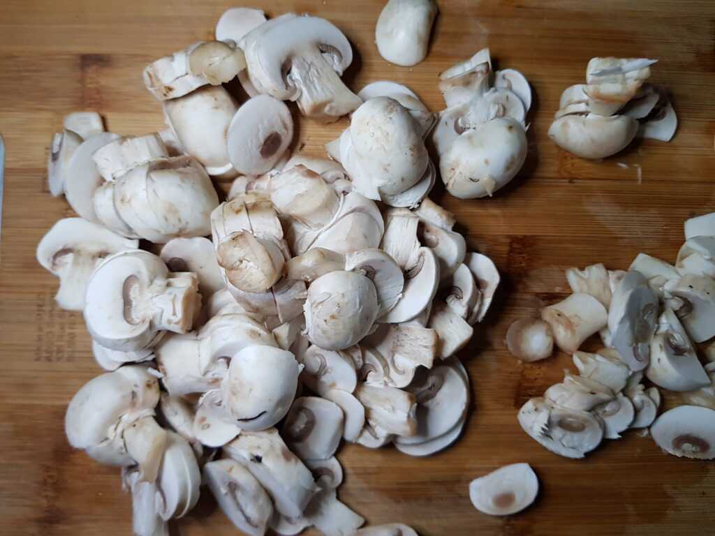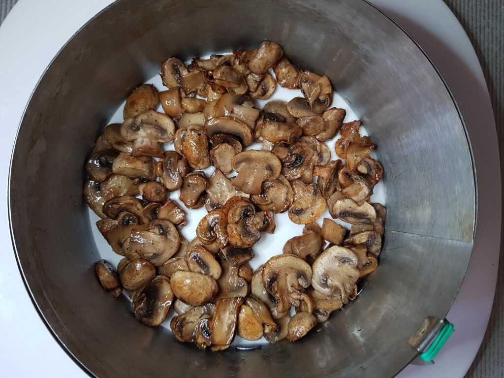 - Шампиньоны помыть и почистить. Нарезать на небольшие кубики. Разогреть сковороду со сливочным маслом и обжарить грибы до готовности (5-7 минут), помешивая. Приправить солью, перцем, лавровым листом и мускатным орехом. Остудить.