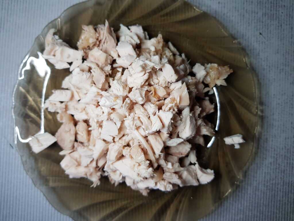 шаг 3Отвариваем 250 г куриного филе, остужаем и мелко нарезаем.