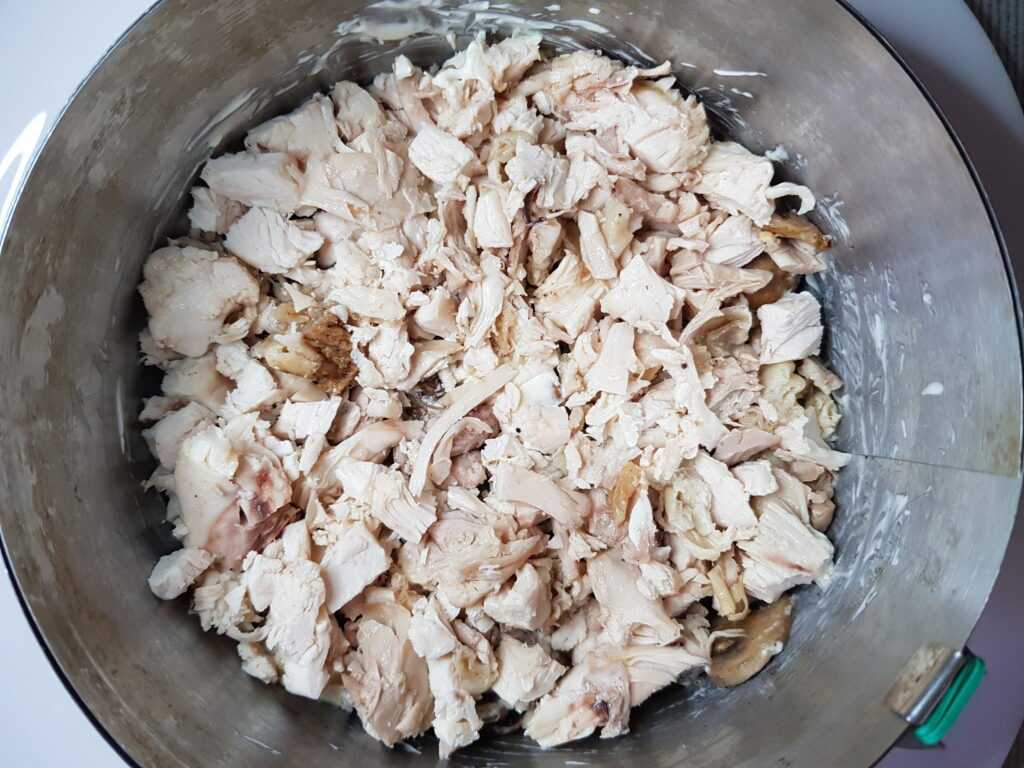 1. Отвариваем, запекаем или жарим куриное мясо.