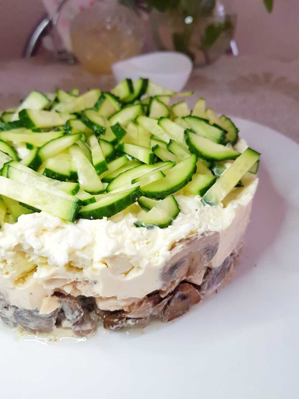 Остается выложить все слоями, каждый слой смазав майонезом. Верхушку салата можно декорировать кусочками грибов или тонкими слайсами огурца.