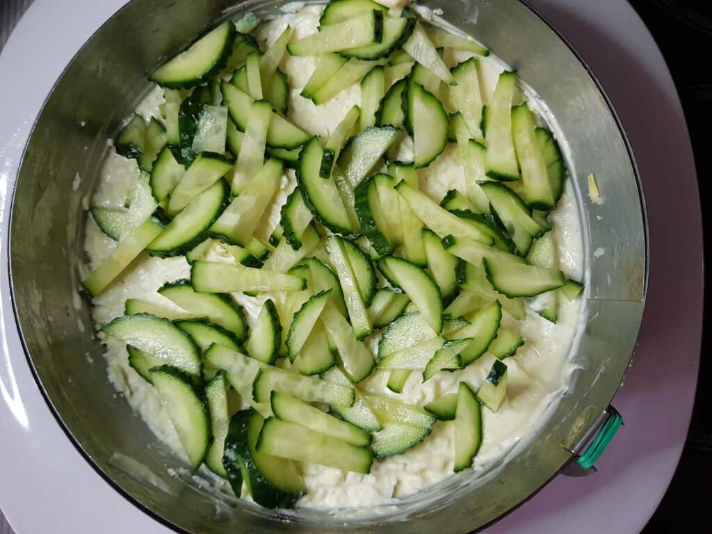 8. Далее укладываем слой из огурца и чернослива. Сверху делаем сеточку из соуса.