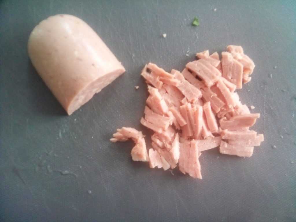 Ветчина для этого салата должна быть, самое главное – вкусная. Иначе вы рискуете испортить вкус блюда просто безнадежно. Ведь именно ветчина играет в нем главную роль, задает тон и настроение. Собственно, вы можете использовать какое-то другое копченое мясо, к примеру, балык, но помните, что это должны быть именно копчености, а не просто отварная телятина или свинина. Мне же очень нравится именно ветчина – она мягкая и идеальна для таких салатов. Нарезаем ветчину кубиками, пластинами или полосками – на ваше усмотрение.