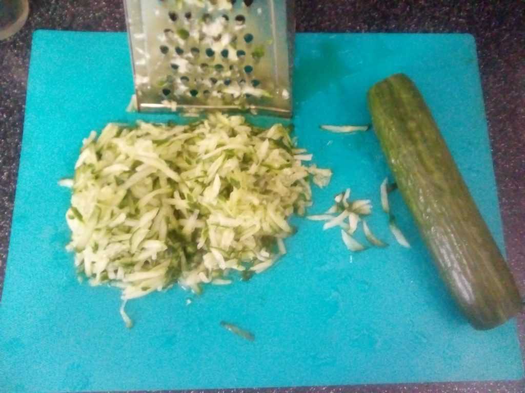 Натереть свежий огурец на крупной тёрке, положить в тарелку и подождать пока сок огурца (может и не быть сока) накопится, потом аккуратно слить.