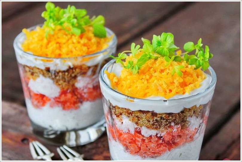 Взять глубокую квадратную форму и застелить ее пищевой пленкой. На дно выложить красную рыбу, нарезанную тонкими слайсами. Лучше всего для этого подойдет лосось. В отдельной миске смешать по 4 ст. л. сметаны и майонеза, а также 100 г творожного сыра — это будет кремовая заправка. 2-3 ст. л. крема выложить на рыбу и размазать. Мелко нарезать сваренные вкрутую яйца и выложить их вторым слоем. Снова смазать кремом и разровнять. Следующий слой — тертые крабовые палочки, их также выложить и смазать. Затем морковь и, наконец, отварной рис. После того, как слои будут смазаны и утрамбованы, салат нужно оставить в холодильнике на ночь. После чего перевернуть форму и достать «рыбный торт».