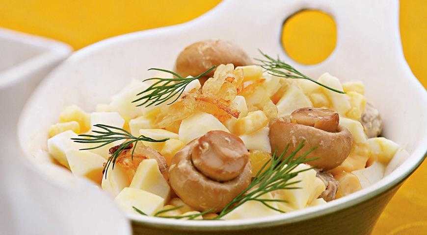 Это нежный и красивый салатик, подойдет для праздничного стола или разнообразит ежедневный рацион. Сыр входит в состав многих рецептов салатов, особенность этого в том, что он содержит не только твердый сорт, но и плавленый сырок. Это придает ему нежную консистенцию и сочность. Лучше взять маринованные шампиньоны, для украшения – маслины.