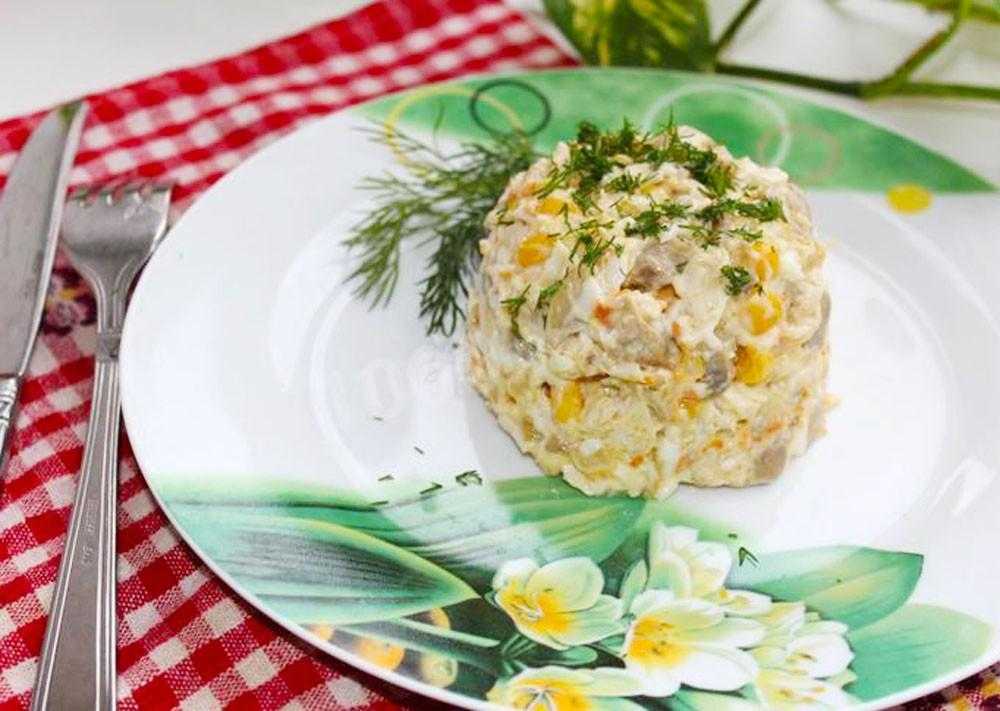 Это классический салат с курицей. Он получается нежным и сытным, поэтому прекрасно дополнит любой прием пищи. А желтые кукурузные зернышки делают его нарядным. Основных ингредиентов нужно взять по 300 г. Кроме этого потребуется: