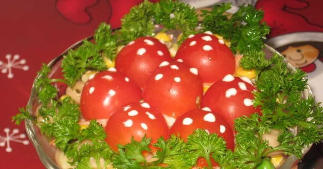 Красивый салатик можно приготовить с помидорами. Они не только сделают его ярким, но и придадут свежести и нежного вкуса. Если готовится салат летом, можно использовать белые грибы или маслята. Но более нарядно он будет смотреться с шампиньонами. Особенность блюда в том, что все продукты нарезаются одинаковыми кубиками. Потребуются такие ингредиенты:
