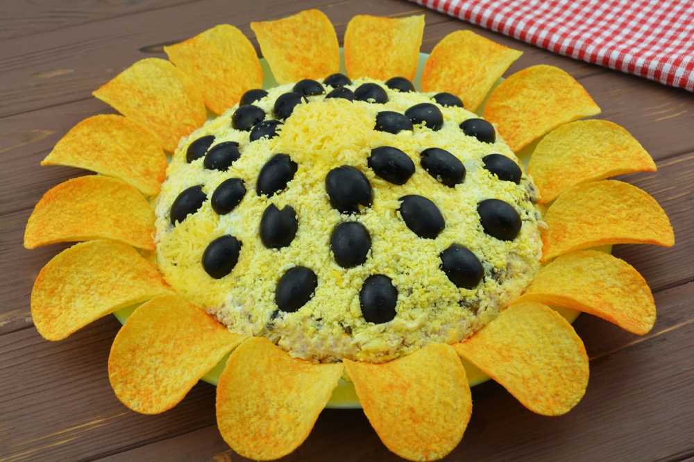 Это блюдо готовить просто, все ингредиенты доступны. Его особенность в оформлении. Готовый салат напоминает подсолнух. Он украсит любой праздничный стол и точно удивит гостей. Ингредиенты для классического рецепта: