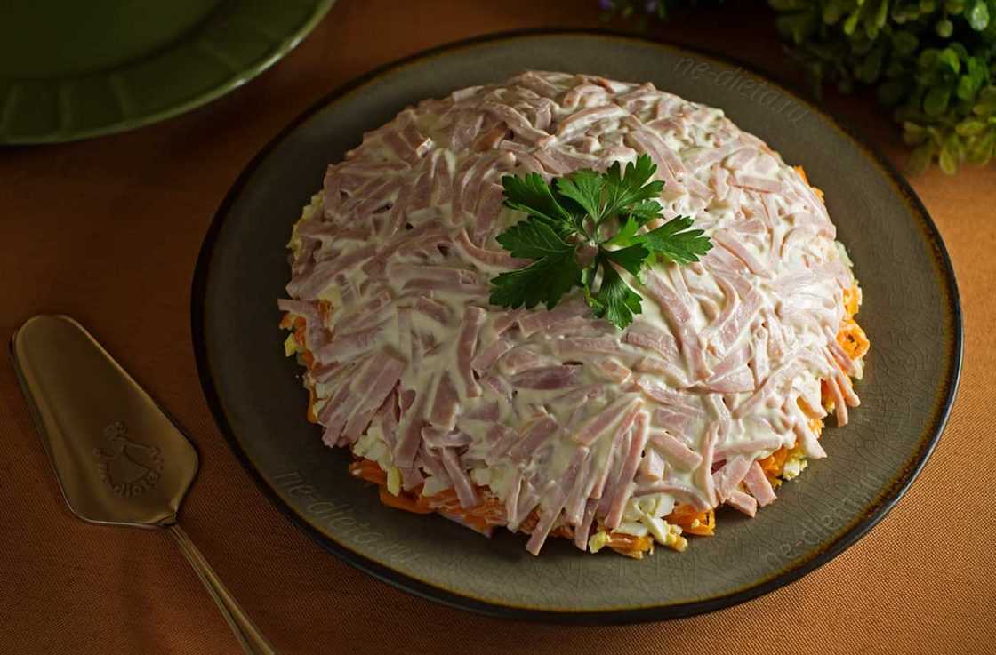 Рецепт 5: слоеный салат с шампиньонами и ветчиной