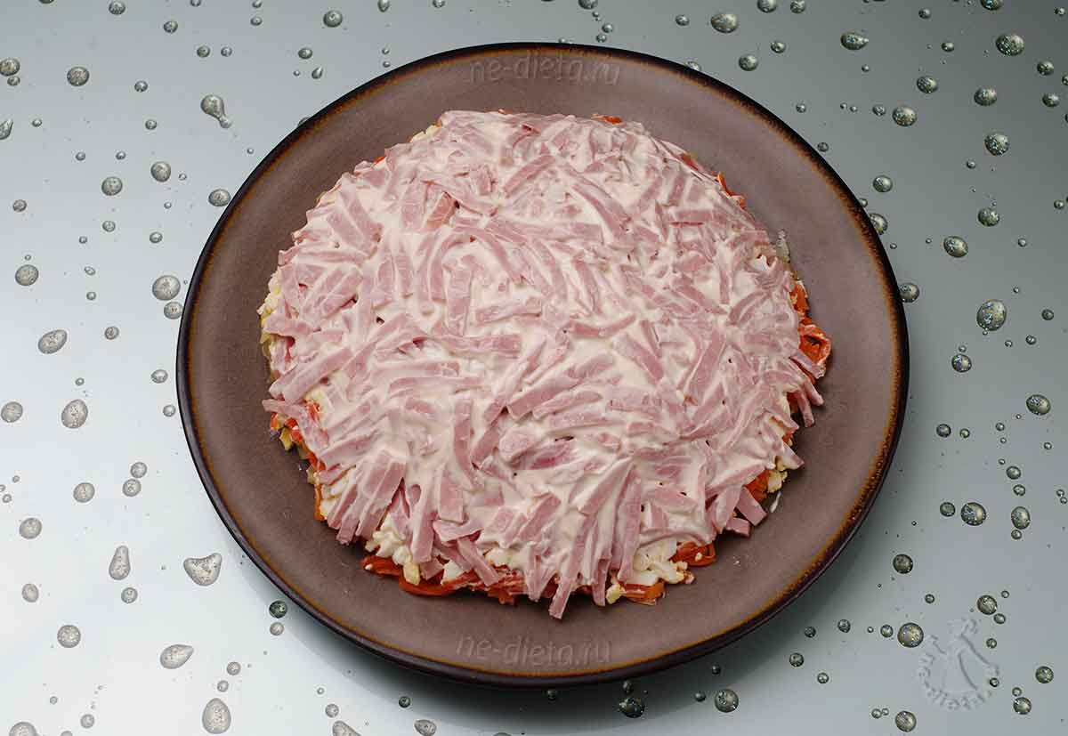 И самым последним слоем следует аккуратно выложить порезанную соломкой ветчину, после чего ровно и красиво заполировать поверхность салата с помощью майонеза.