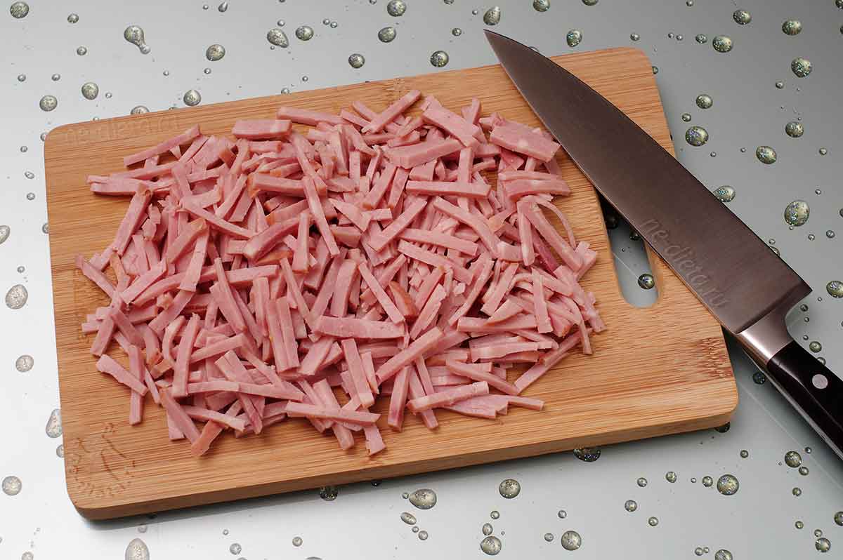 Ветчину порезать тонкой, но не слишком длинной соломкой.