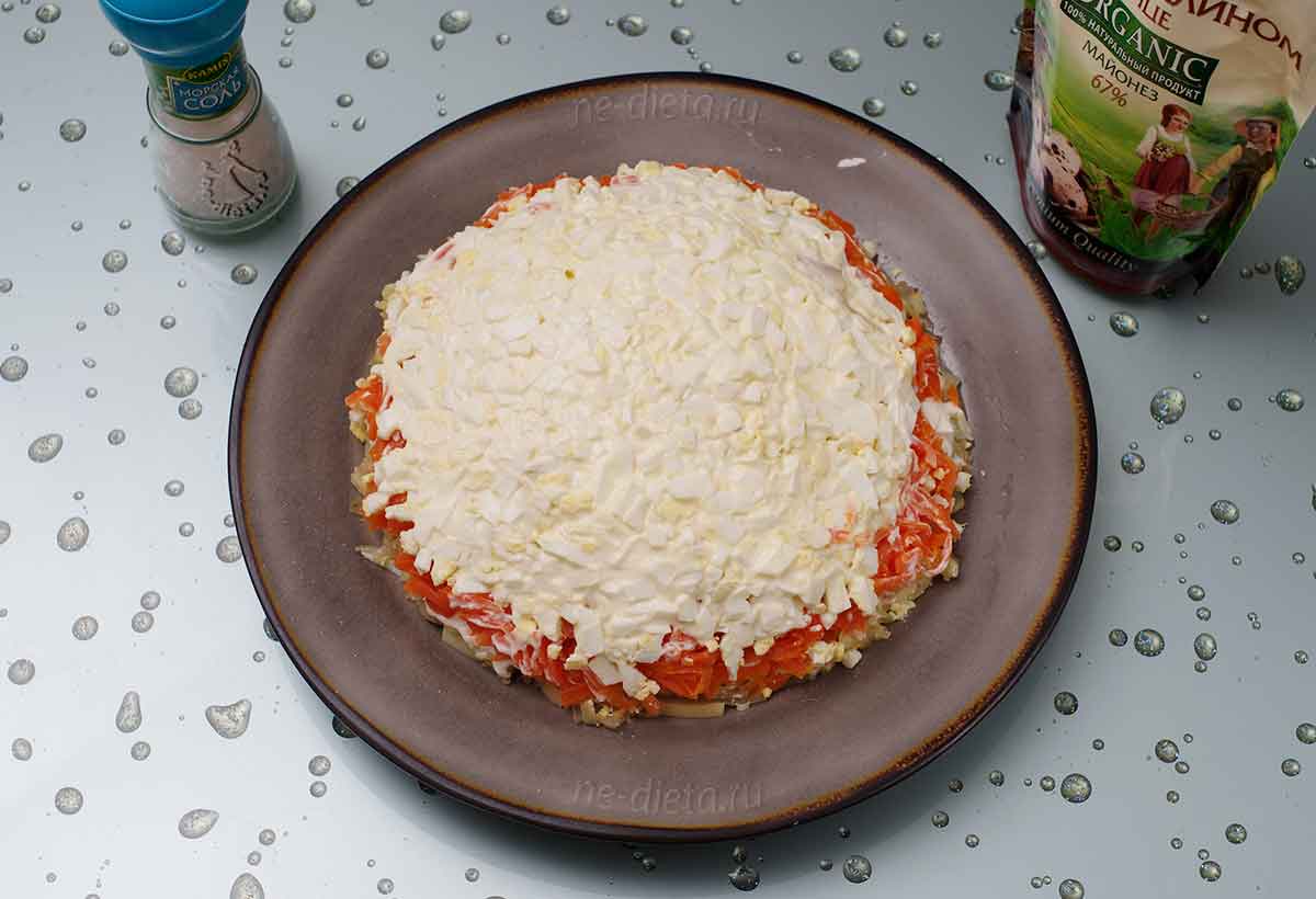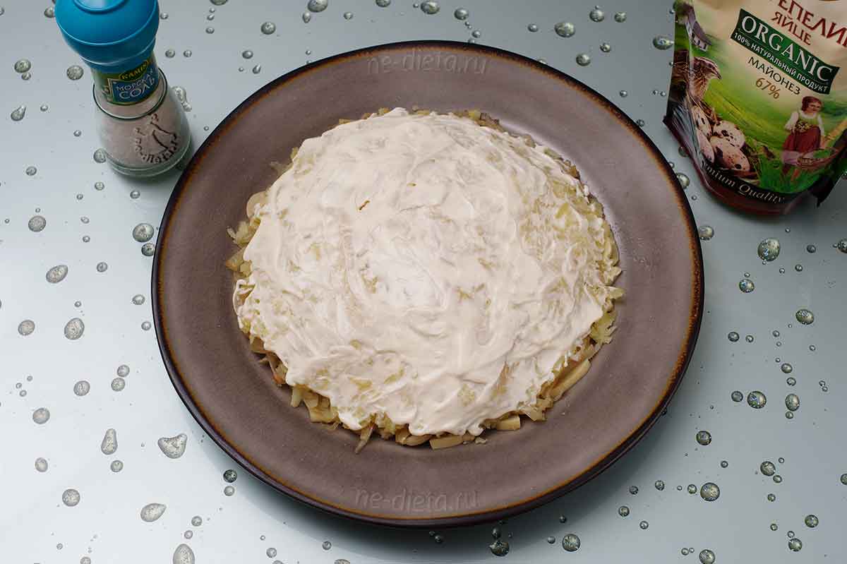 2) Выложите салат слоями, не забывая про майонезную сетку. Должна получиться такая очередность: