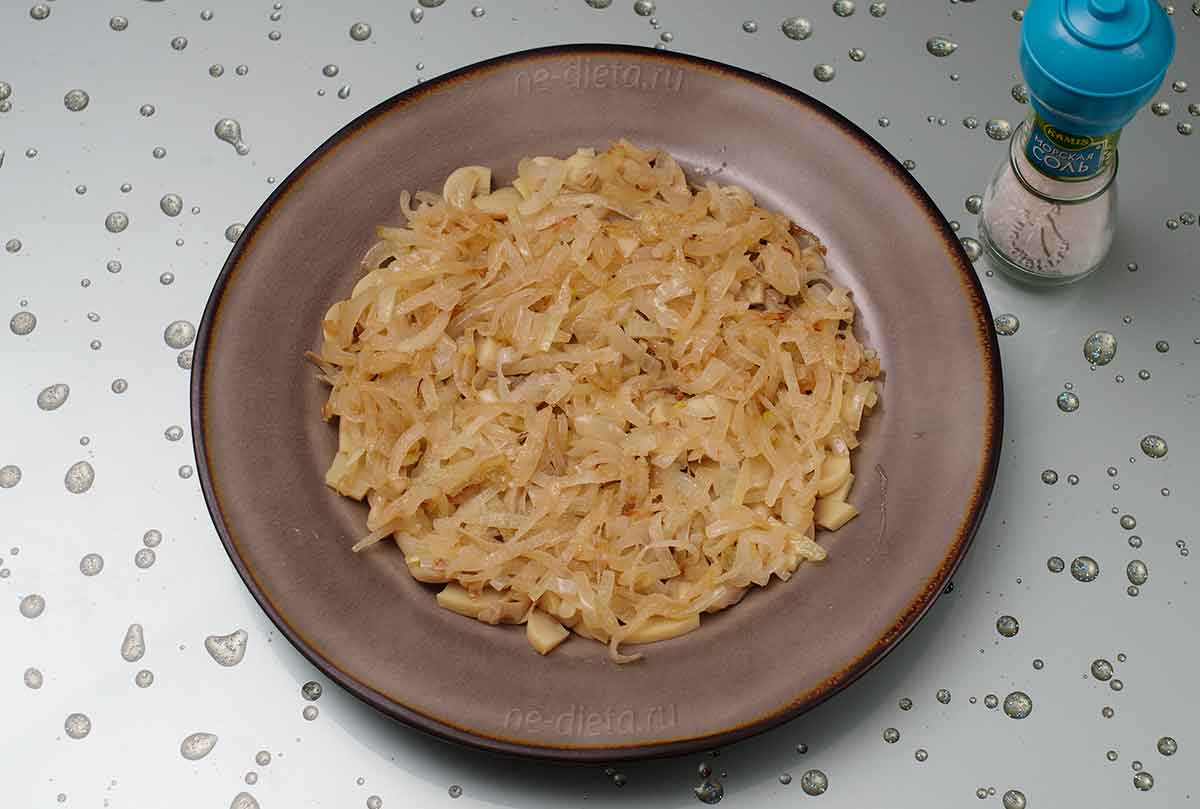 Итак, в качестве первого слоя салата с ветчиной и грибами надо положить резаные консервированные шампиньоны, поверх них распределить обжаренный репчатый лук и все слегка посолить.